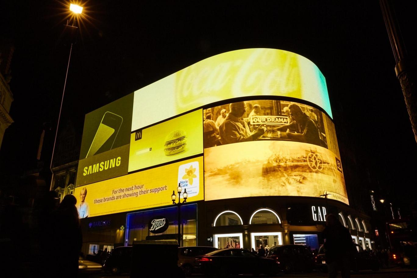 Piccadilly Circus’s iconic billboards turned yellow for an hour in support of UK nurses working through the night to care for people living with terminal illness.