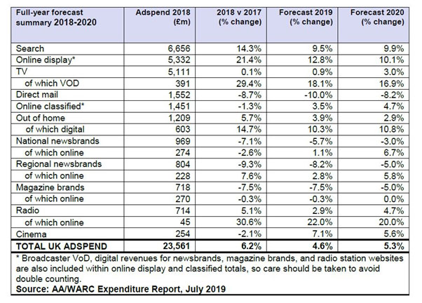 The report forecasts growth to £24.6bn for 2019, equivalent to a 4.6% annual increase, with the UK’s ad market expected to grow a further 5.3% in 2020.