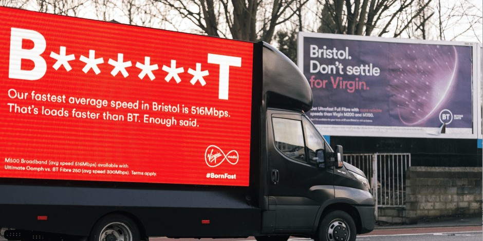 Virgin Media responded to BT’s ‘bullshit’ ads by placing mobile billboards in front of BTs. Against the backdrop of Virgin’s branded red, the ad erected on its vans read’s ‘B*****T Our fastest average speed in Bristol is 516Mbps. That’s loads faster than BT Enough said.’
