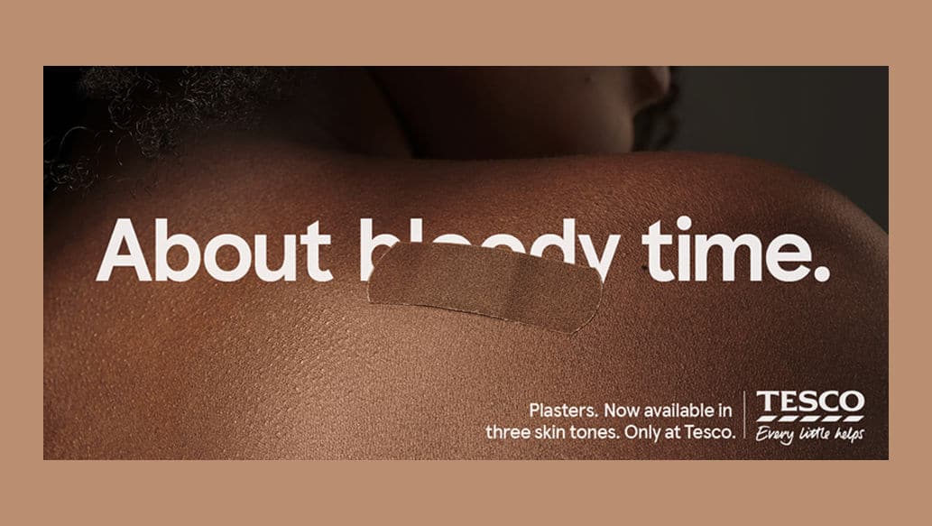 “About bloody time” is the bold tagline of a new new print campaign from Tesco, supporting its move as the first U.K. supermarket to store bandages with a diverse range of skin tones.